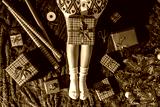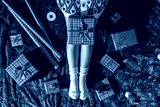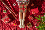 Top view of woman with christmas gift box on knees. Female wrapping gifts for family sitting on fluffy plaid near christmas tree. Flat lay.