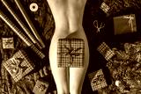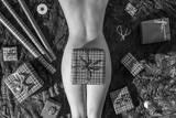 Top view of naked woman in santa claus hat lying on fluffy plaid near christmas tree on with christmas gift box on buttocks. Concept. Flat lay.