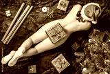 Top view of naked woman in santa claus hat lying on fluffy plaid near christmas tree on with christmas gift box on buttocks. Concept. Flat lay.