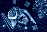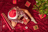 Top view of woman in red santa claus hat wrapping christmas gifts boxes for family sitting on fluffy plaid near christmas tree. Flat lay.