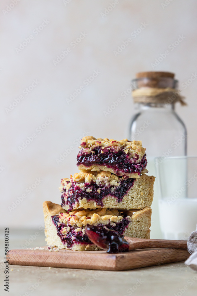 Homemade berries jam shortcrust squares and glass of milk, light concrete background.