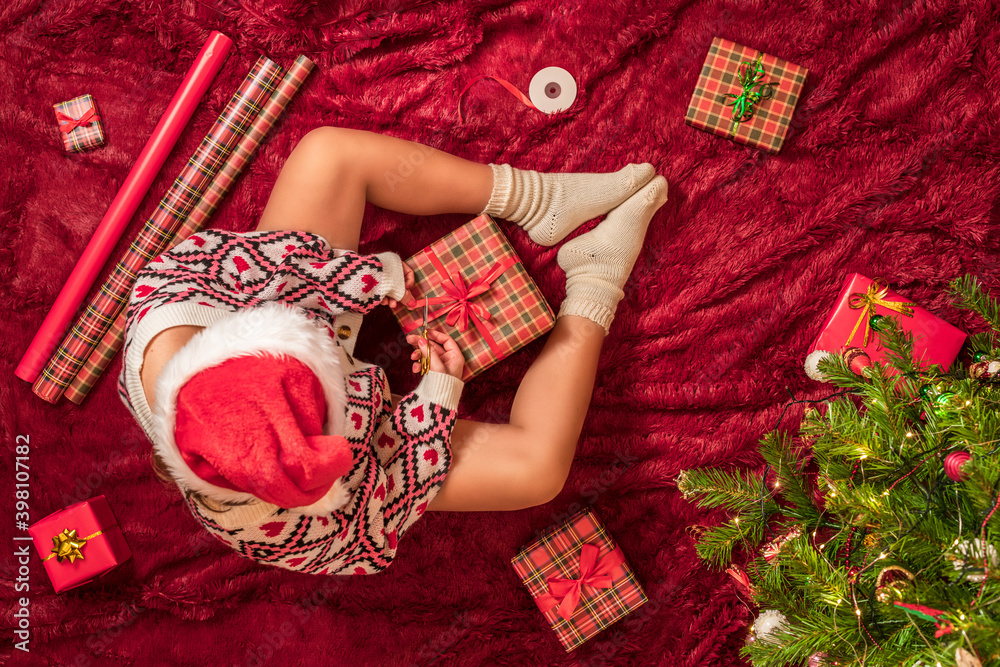 Top view of woman in red santa claus hat wrapping christmas gifts boxes for family sitting on fluffy plaid near christmas tree. Flat lay.