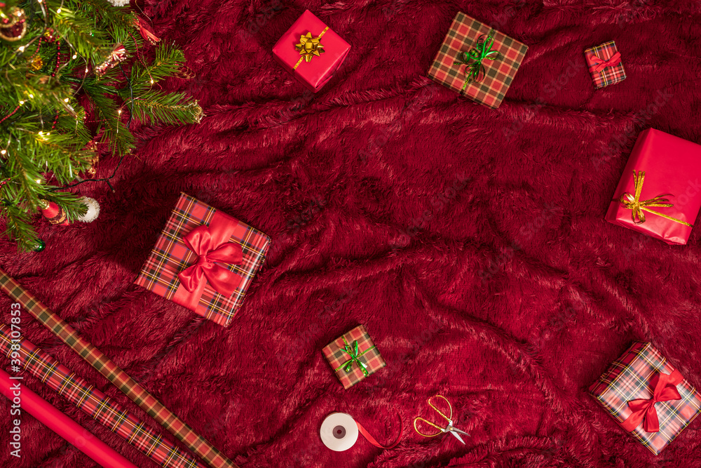 Wrapped christmas gifts boxes for family lying on fluffy plaid near christmas tree. Top view, flat lay