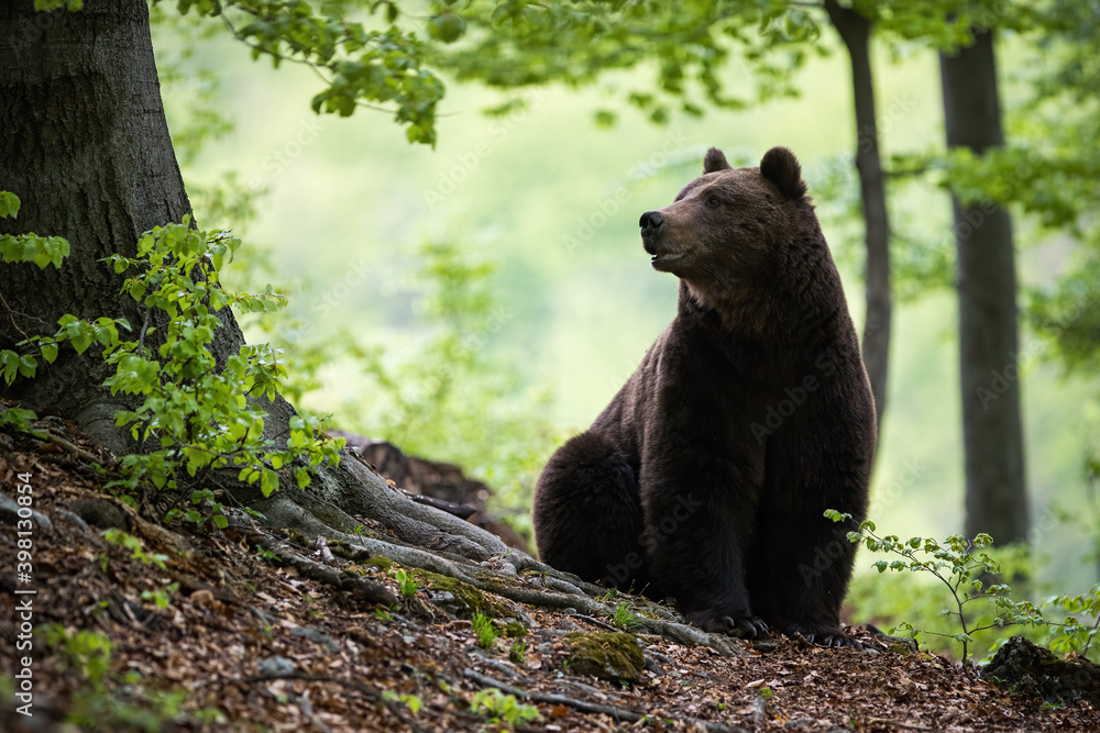 Massive brown bear, ursus arctos, sitting on the ground surrounded by green leaves in woodland. Dominant mammal with dark fur resting in green environment from front view.