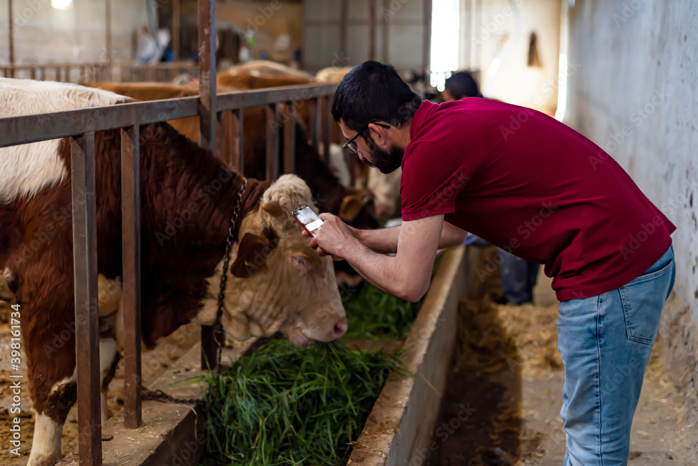 Smart Agritech livestock farming. Young farmer using a smart phone and statistics wireless on a smart phone app in a modern barn. Reading a dairy cows data ear tag