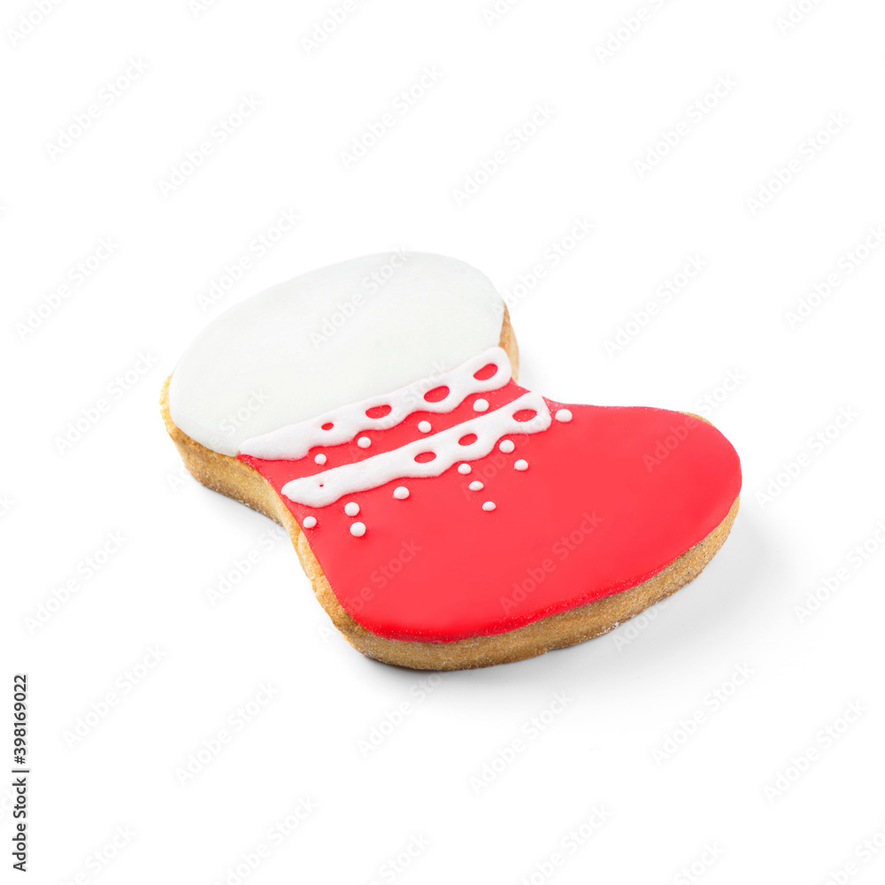 Christmas gingerbread boots cookies isolated on white background. Winter baking at Xmas or New Year holiday