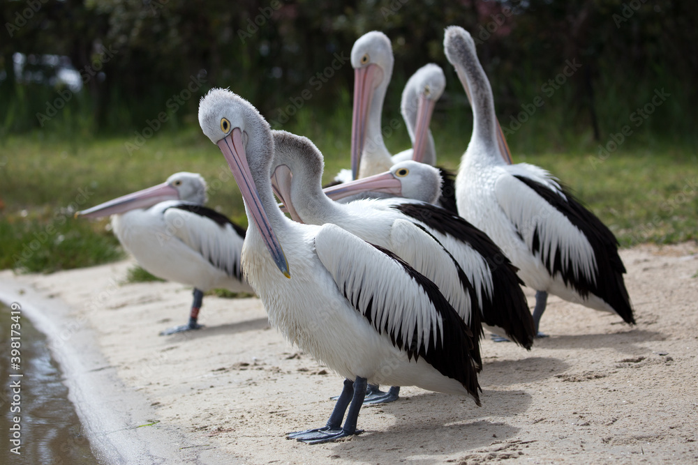 The Australian pelican is a large waterbird and is widespread on the inland and coastal waters of Australia. It is a predominantly white bird with black wings and a pink bill.