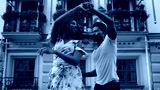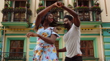 Happy afro dancers curling in latino dance in city. Couple dancing on street