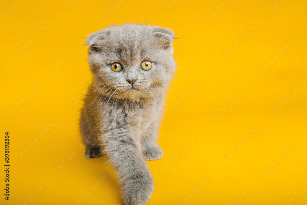 A gray cat with beautiful eyes on a yellow background