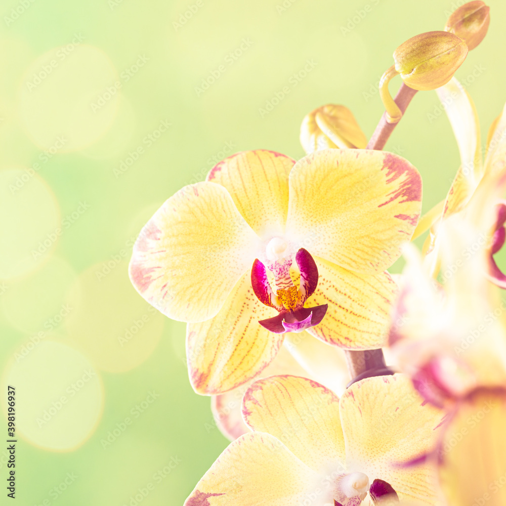 Most commonly grown house plants. Greeting card with bokeh. Close up of orchid flower yellow bloom over green background. Phalaenopsis orchid. Botany concept with copy space.