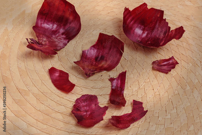 Dried red onion husk on a straw napkin on the floor close up
