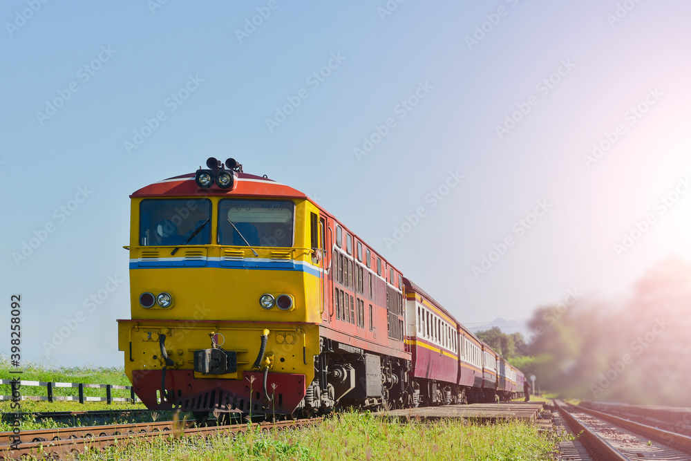 Front of Train yellow and orange Diesel electric locomotive on the tracks of thailand