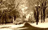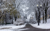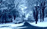 Winter park, winter city landscape. Snow, city, lights and trees in a city park
