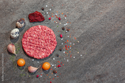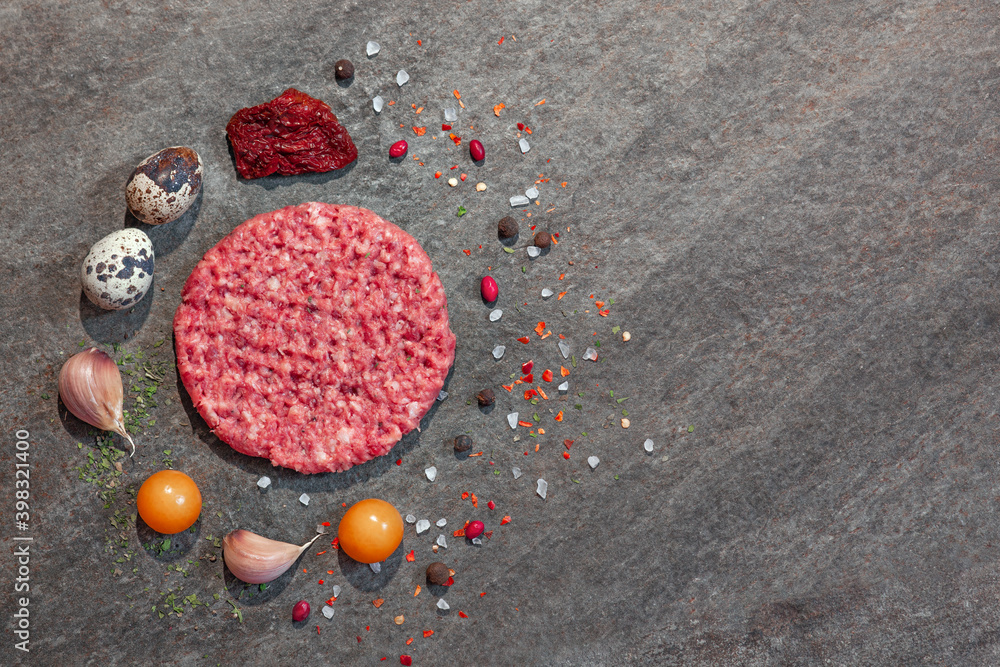 minced meat with spices, chopped beef for steak on a stone background, pepper, herbs, eggs around, top view, place for text, free space