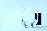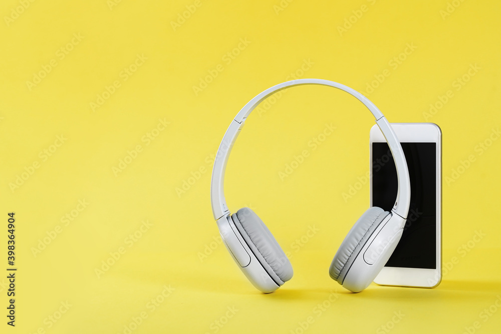 Wireless funky modern gray headphones with mobile touch phone on illuminating yellow background. Remote learning or listening to music or radio