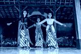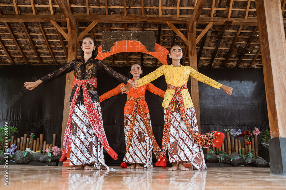 portrait of three young women presenting traditional Javanese dance movements in traditional javanese joglo house