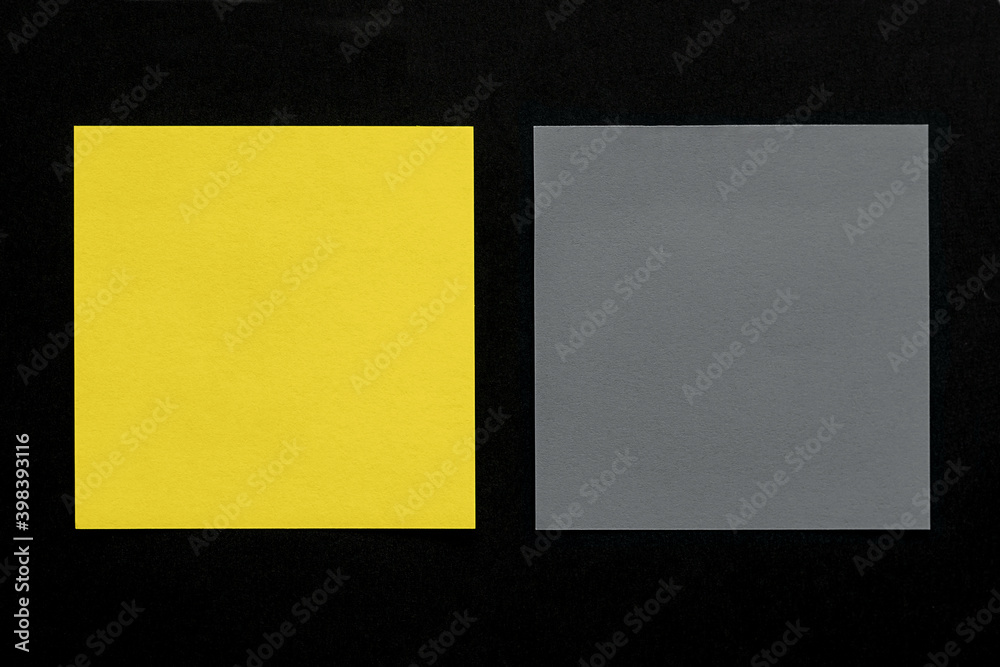 Yellow and gray blank stickers on black background, mockup. Trendy colors 2021