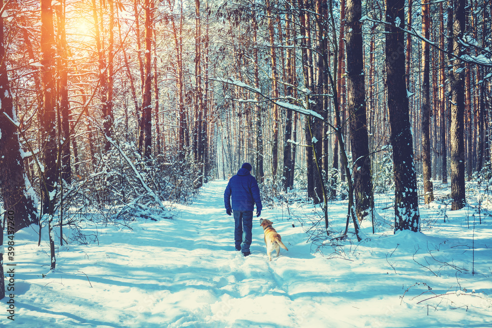 Man and dog are best friends. A man with a dog walks in a snowy forest on a sunny winter day