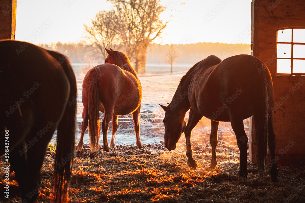 Group of horses exiting the stable on a cold winter morning