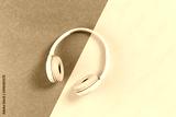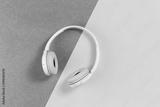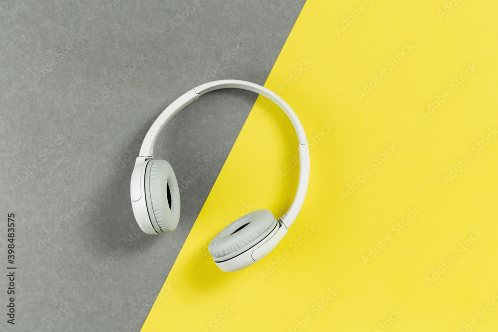 Wireless funky modern gray headphones on illuminating yellow and grey background. Remote learning or listening to music or radio. Trendy lifestyle concept with copy space