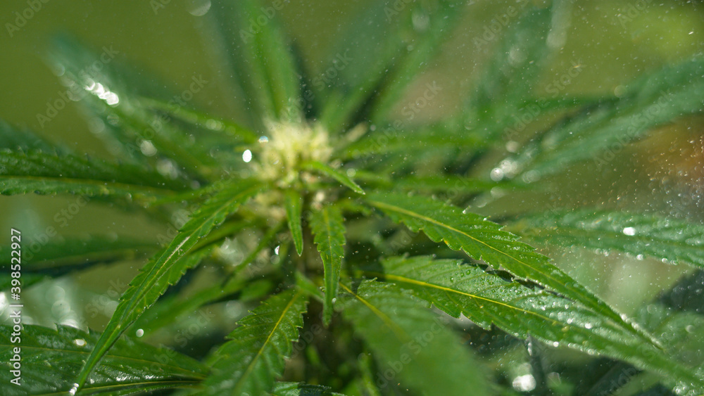 CLOSE UP: Tiny sparkling drops of water fly at the long leaves of a hemp plant.