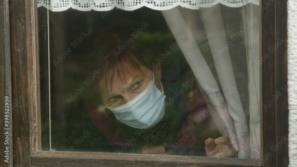 CLOSE UP: Lonely lady anxiously observes neighborhood in the midst of pandemic.