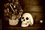 Human skull in red Santa Claus cap, Christmas tree with balls toys and candy canes, on wooden background. Scary halloween and christmas or new year concept. Tinted.