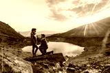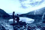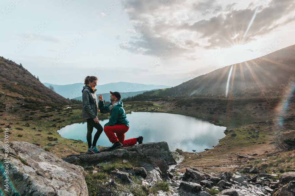 A hiker tourist proposes to marry his girlfriend at dawn in the middle of the mountains. Declaration of love on a high mountain lake, love on a hike.