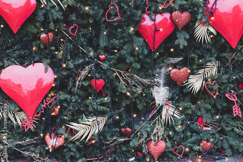Green spruce branches decorated for Christmas with Christmas decorations in the shape of hearts. Matte toning.