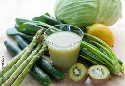 A lot of green vegetables placed on a wooden background and a glass of vegetable juice