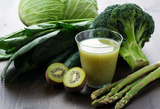A lot of green vegetables placed on a wooden background and a glass of vegetable juice