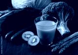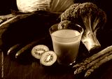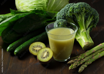 A lot of green vegetables placed on a wooden background and a glass of vegetable juice