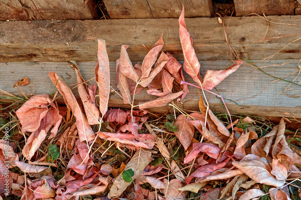 The winter wind carried the dry frozen leaves of the trees to a sheltered place behind a wooden shed
