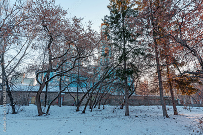 The Orthodox Church is visible behind the stone fence of the winter city Park