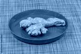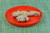 Ginger root in a red plate on a Cutlery napkin close up