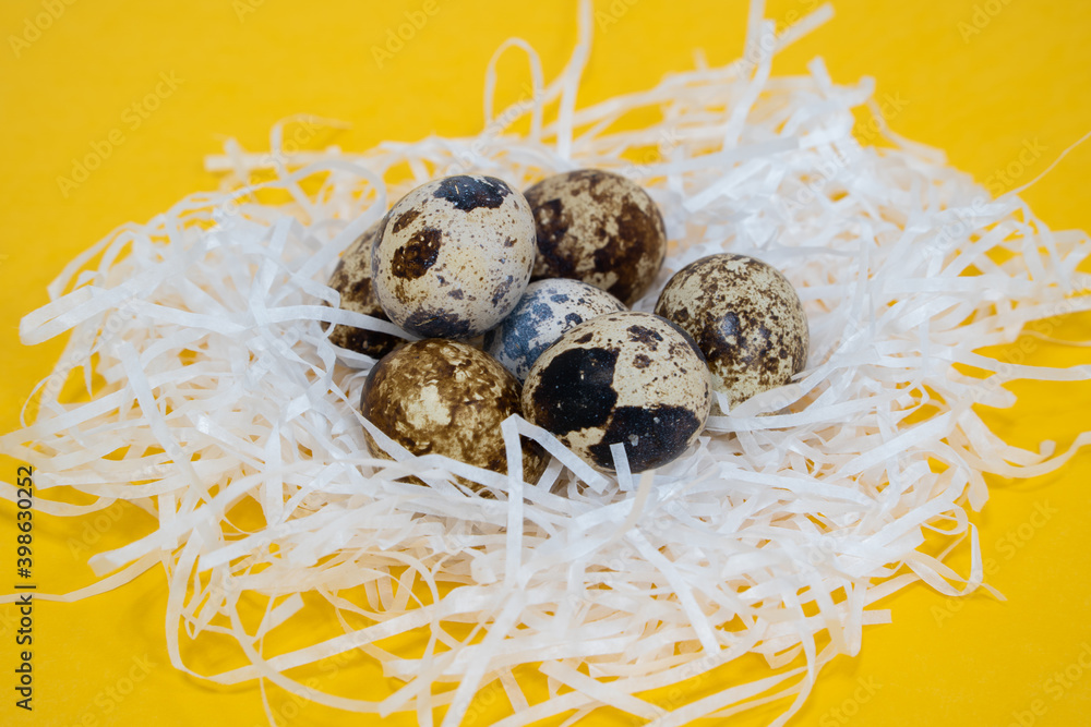 Natural food. Raw quail eggs in a nest made of white paper on a yellow background. Low-calorie protein food.