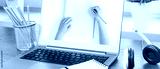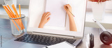 Laptop with hands drawing or writing on the monitor screen and headphones on a desk near window. Distant learning or working from home, online courses or school webinar concept. Banner