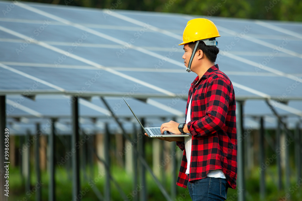 Asian engineer working on checking equipment and use a laptop to measure the heat temperature in solar power plant.