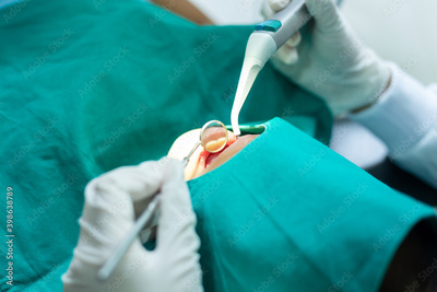 Close up hand dentist check teeth milk tooth of Child is sitting in a dental chair inspecting her teeth looking thru tooth-shaped mirro