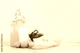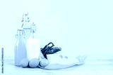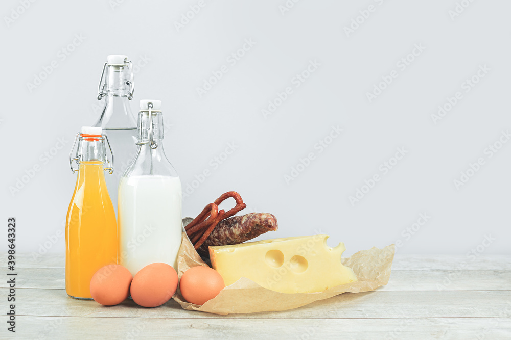 Plain paper bag with dairy produce, eggs cheese with water milk glass bottles on grey. Food delivery service copy space. Grocery store or produce market or farmers small business