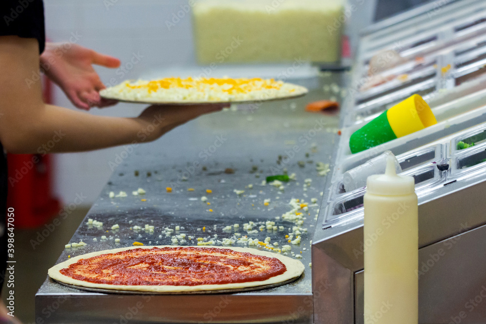 Cook in the kitchen putting the ingredients on the pizza. Production and delivery of food.