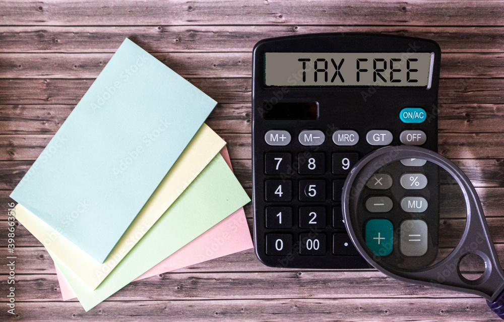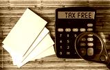 Calculator with the text Tax Free on display, next to stickers and a magnifying glass on a wooden table.