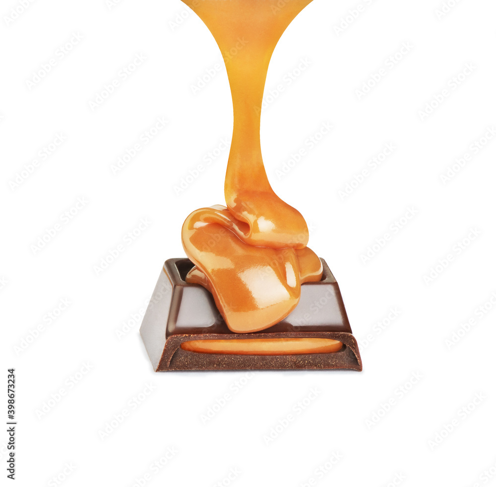 chocolate candy poured with caramel on a white background