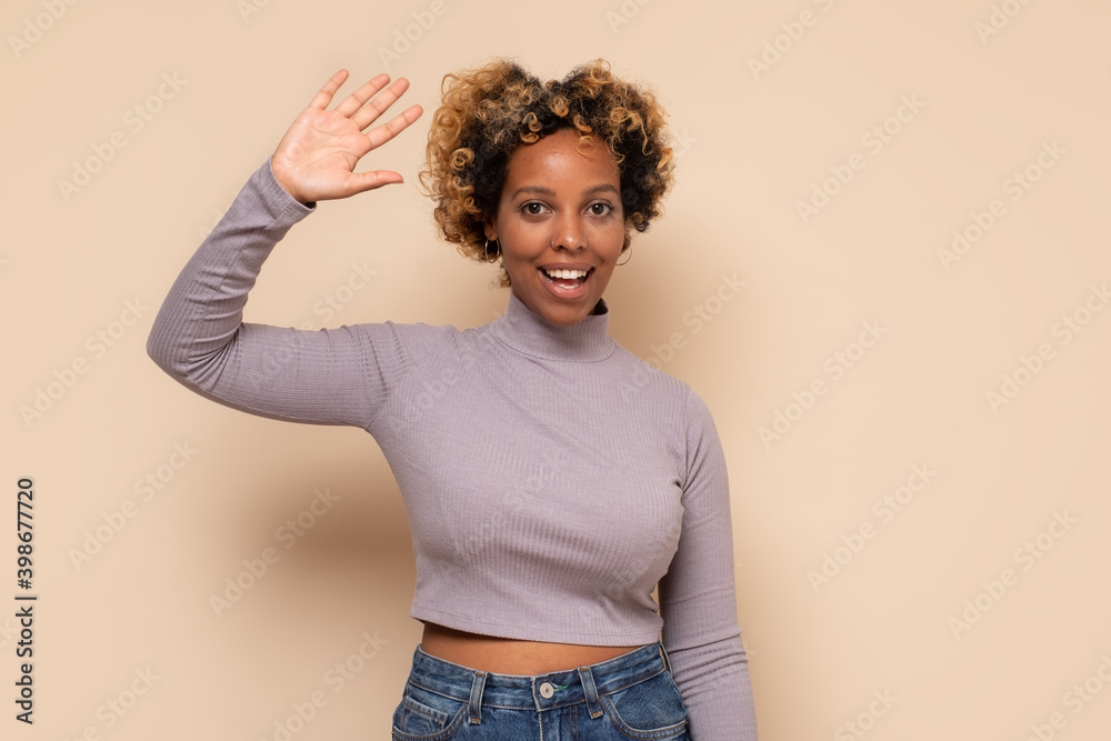 Beautiful young african american woman waving saying hello happy and smiling
