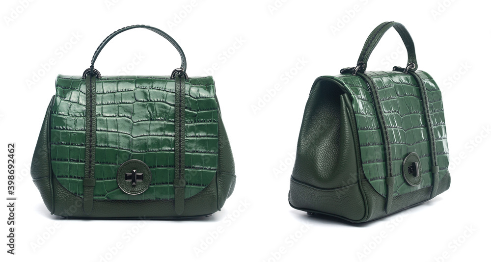 green leather handbag with snake skin elements isolated on white background