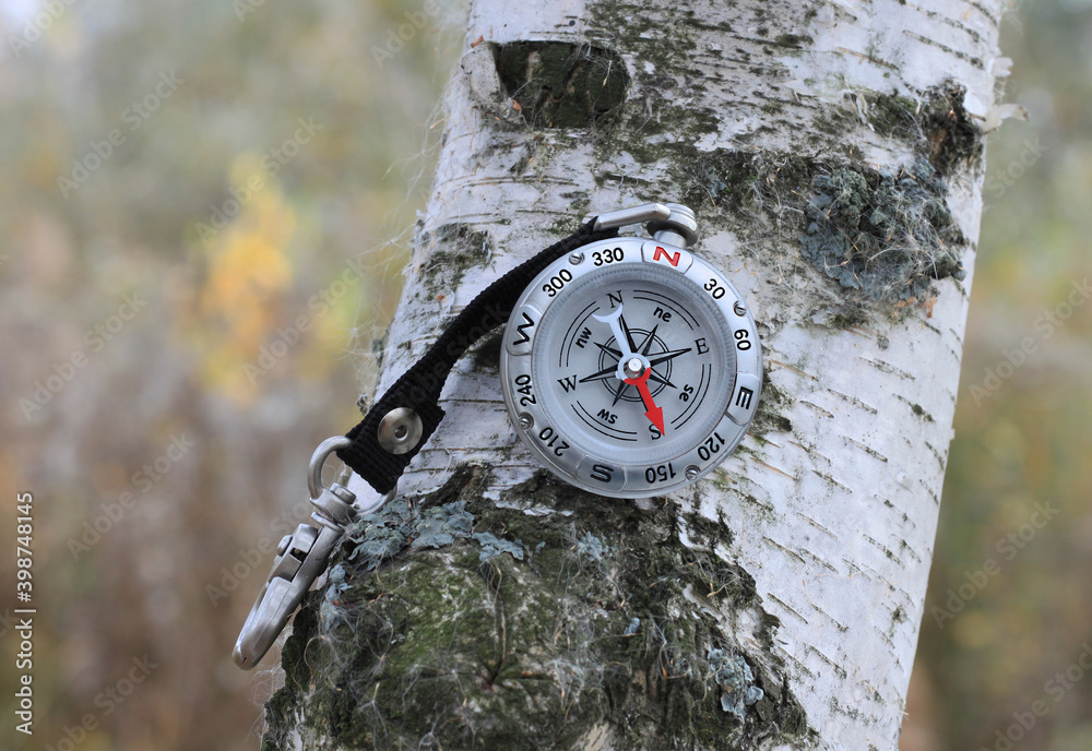 Classic navigation compass on natural background as symbol of tourism with compass, travel with compass and outdoor activities with compass