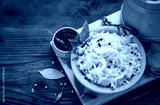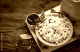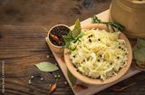 Homemade sauerkraut with black pepper and spices on the wooden table