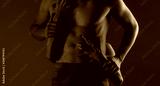 muscular naked man and female hands holding his chest. Couple in love. Sensual. Sexy photo.