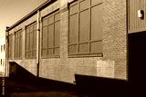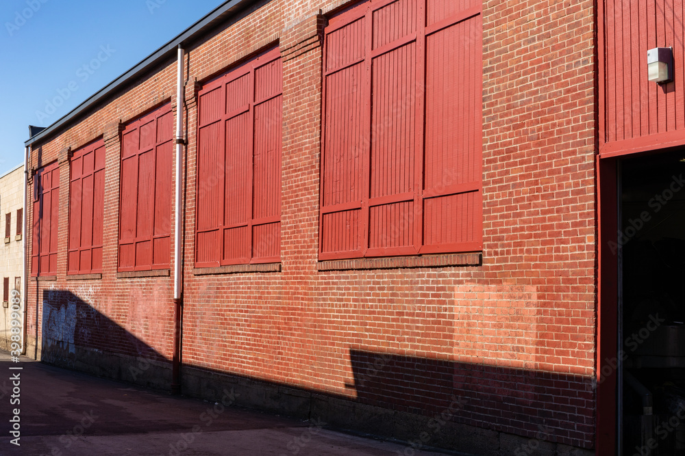 Long view of old red brick commercial industrial building with windows shuttered, loading dock door, horizontal aspect