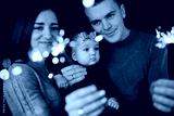 portrait of happy family, mom, dad and baby girl with sparklers and light. family in anticipation of Christmas. selective photo.